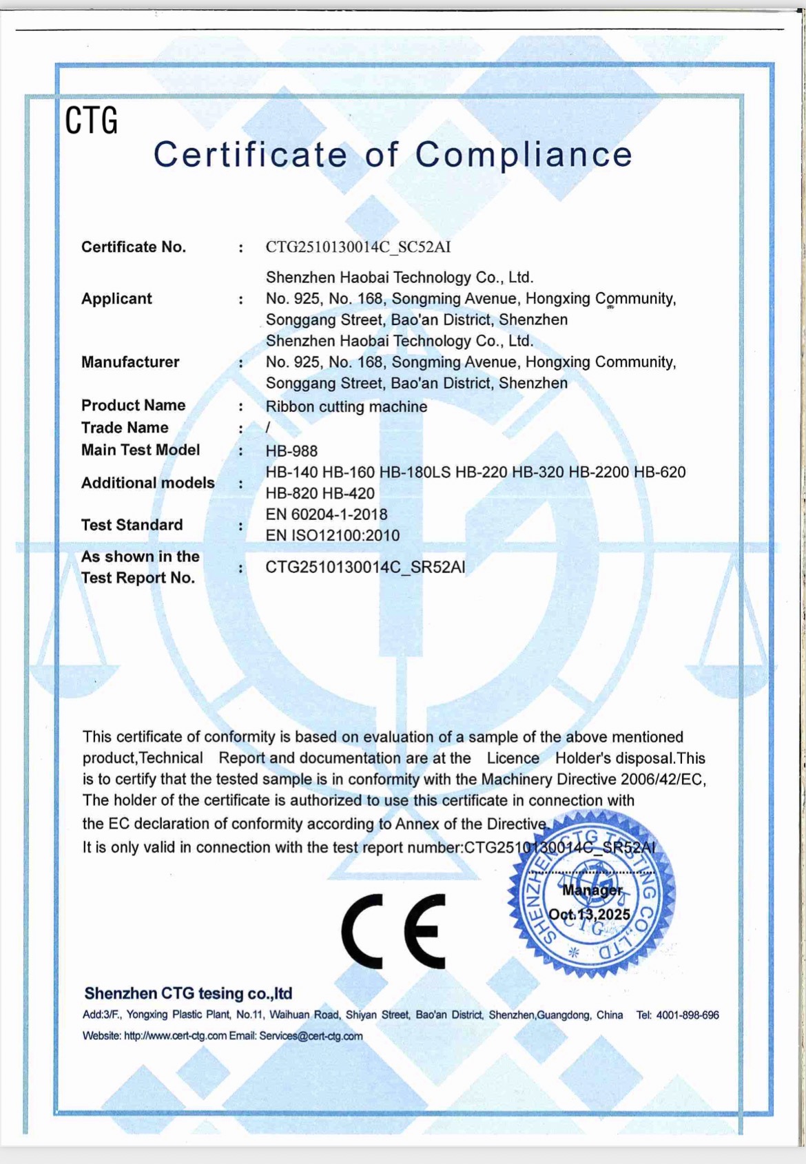 Shenzhen Haobai Technology Co., Ltd. has a 20-year history, specializing in the research and development and production of computerized ribbon cutting machines. We support customized machines. Our machines include cold and hot cutting ribbon machines, ultrasonic ribbon cutting machines, rope cutting machines, label cutting machines, elastic band cutting machines, dovetail cutting machines, cold and hot punching ribbon cutting machines, zipper point cutting machines, 45-degree angle ribbon beveling machines, laser cutting machines, rounded corner Velcro cutting machines (shapes can be customized), heavy-duty 160 cold and hot cutting machines, rotating angle cold and hot punching ribbon cutting machines, ultrasonic label cutting machines, ultrasonic elastic band cutting machines, ultrasonic folding cutting machines, robotic arm material cutting machines, and more. Our hot and cold cutting machines are available in various widths, including 95mm, 125mm, 155mm, 200mm, 300mm, 400mm, and 500mm. These machines are widely used in garment factories, handbag factories, textile industries, ribbon factories, elastic band factories, rope factories, shoe factories, luggage factories, leather factories, backpack factories, gift factories, PVC factories, bubble wrap factories, bungee rope factories, and more. We offer prompt after-sales service; if your machine encounters any problems, we will help you resolve them as soon as possible.Our customers are located in 40 countries and regions worldwide, with over 2000 customers using our machines.