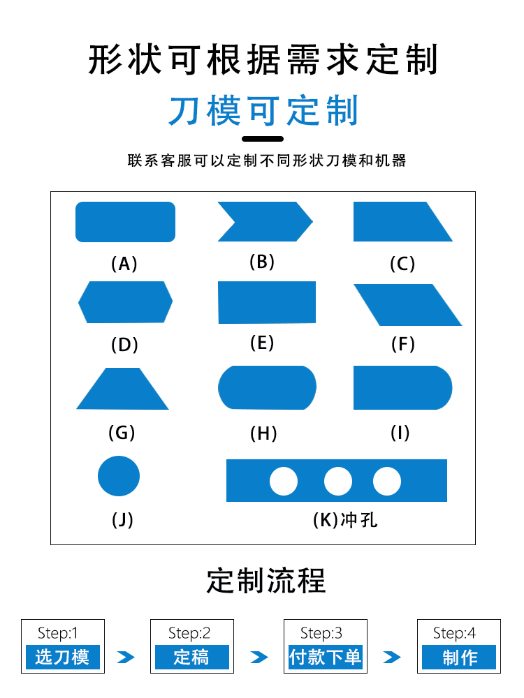 PVC and Velcro shapes can be customized according to customer needs. Contact us and leave a message to recommend the most suitable die-cutting mold and machine for you.